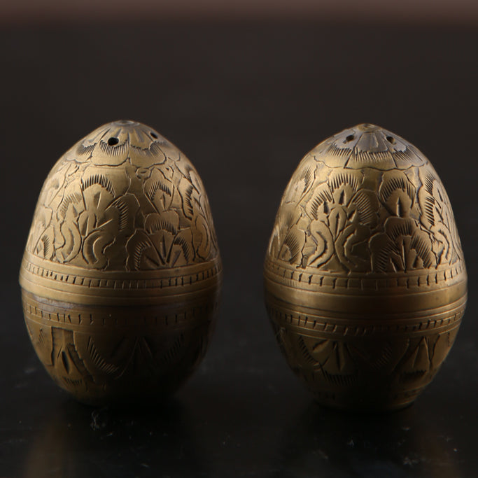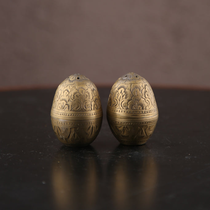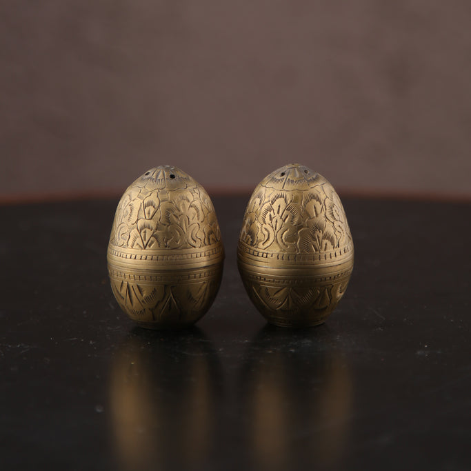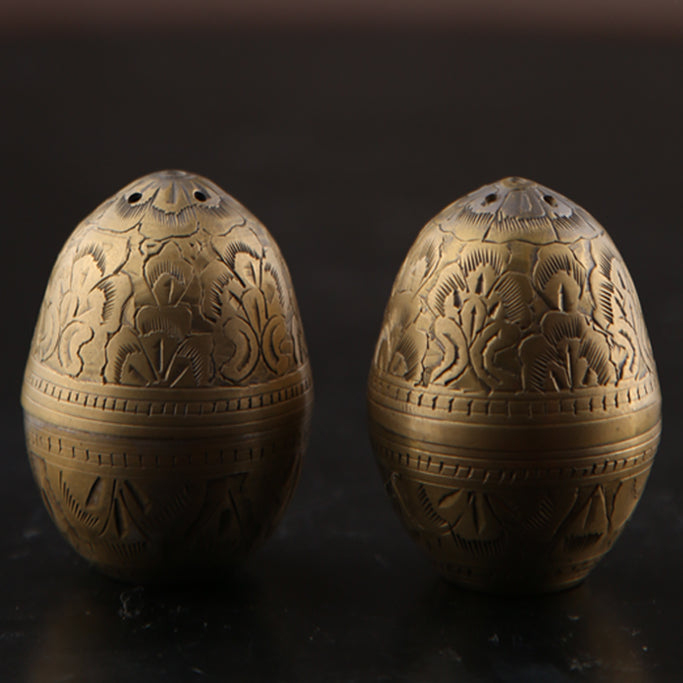 とても細かい彫刻が施された塩胡椒シェイカーです。卵型でちょこんと小さいフォルムの中に繊細なデザインが存在感を放っています。